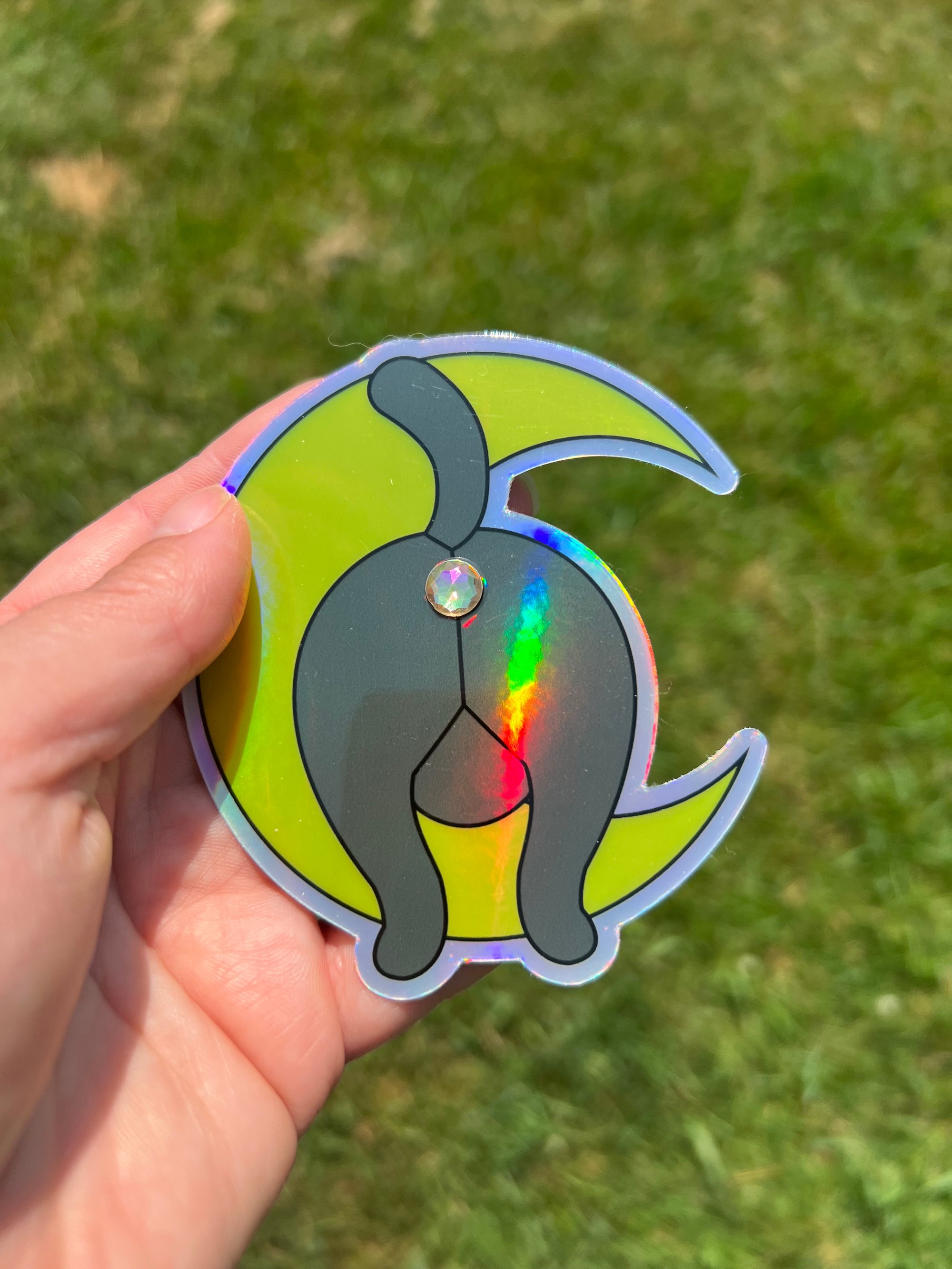 An iridescent champagne butthole jewel was gorilla glued onto the sticker for a strong hold. Although the glue is rated for the elements, I would still use caution if attaching to a surface that will frequently get wet. I would most recommend using these butthole stickers on a dry surface that will not frequently get knocked around or bumped into (just incase).